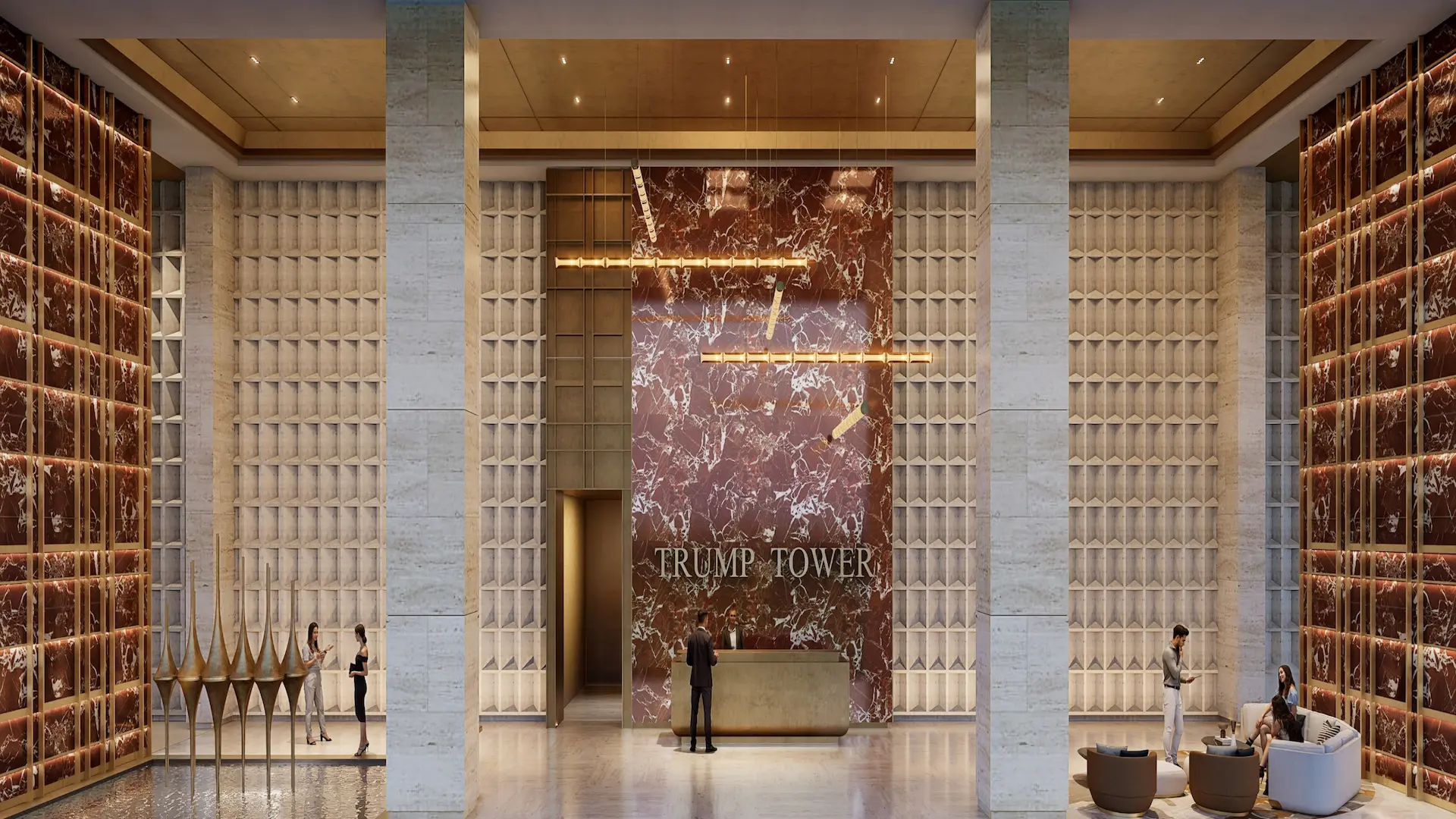 Majestic marble-clad entrances featuring bespoke gold detailing.