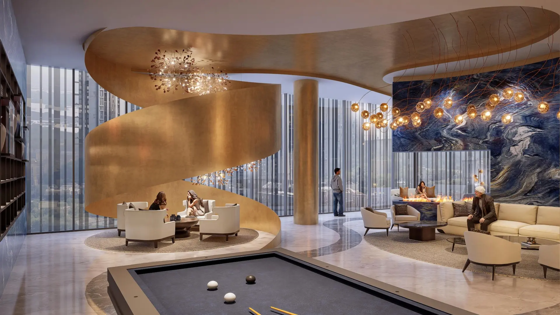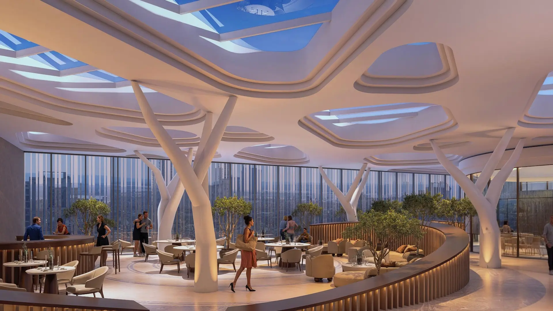 Residents enjoy access to a globally curated lifestyle, including a Double-Height Lobby, High-Altitude Fine Dining, an Aquarium Lounge, a Sky Lounge with architectural tree columns, and a premium Billiards room.